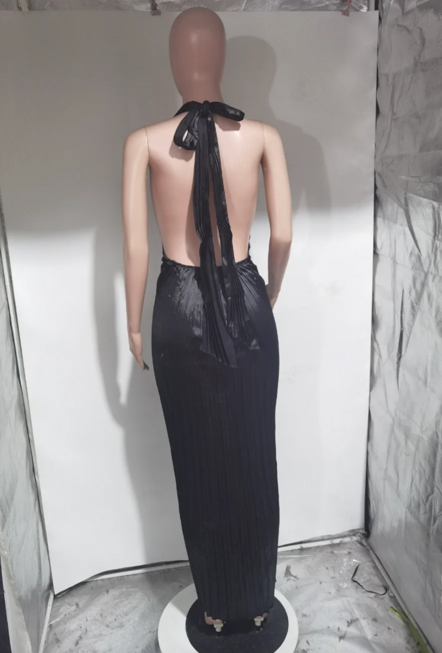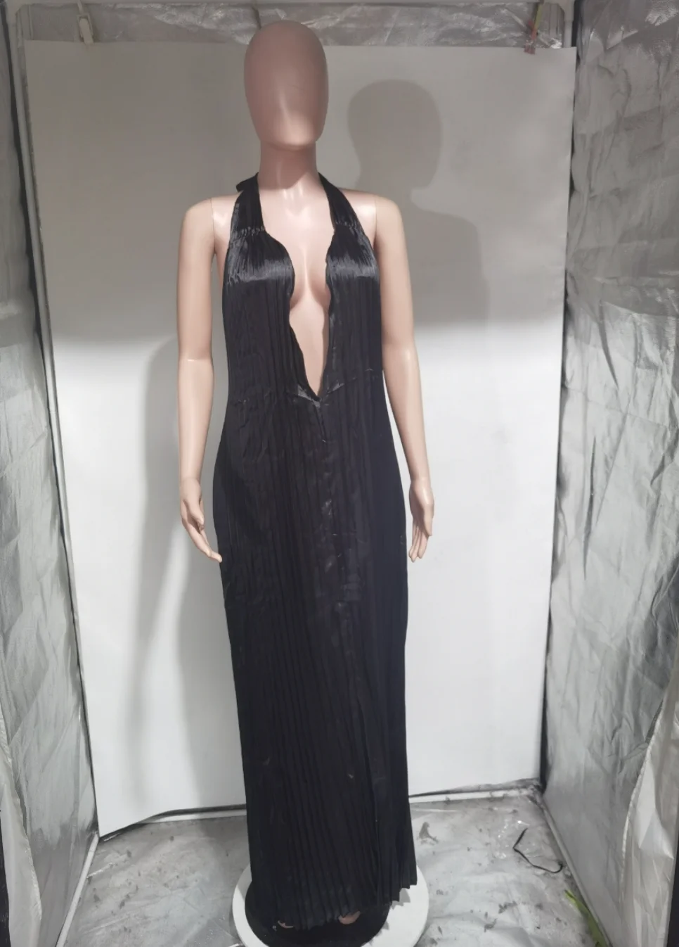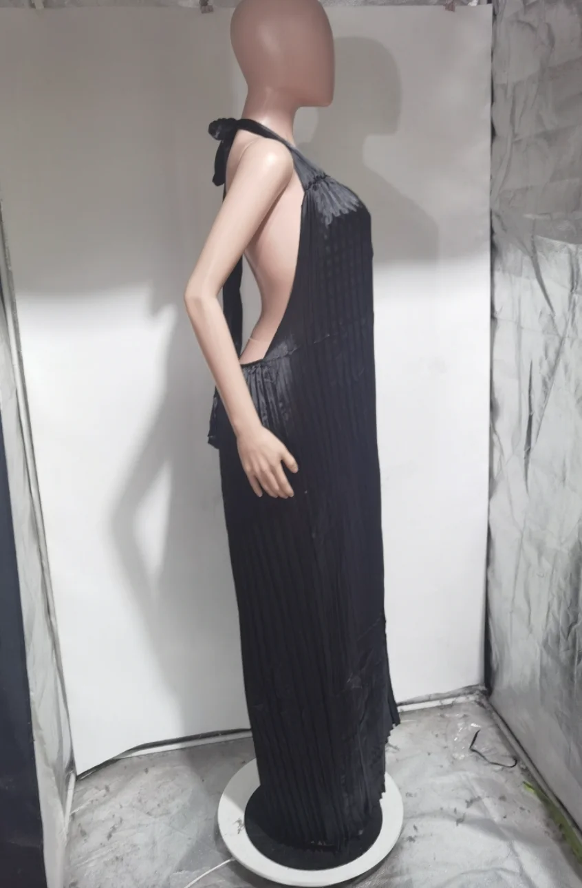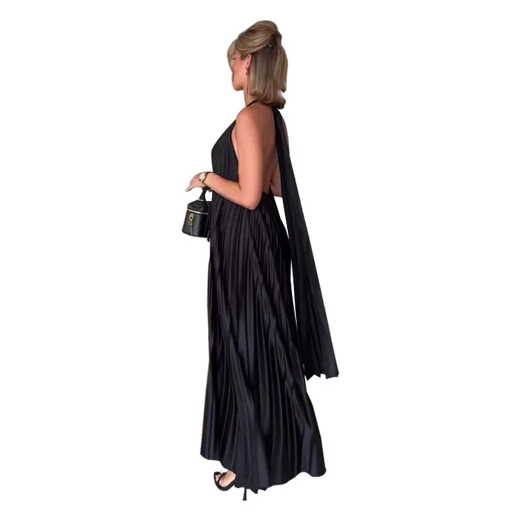 Liu Ming Hot Trending Products 2024 Summer Elegant Fashion Halter Neck Solid Color Pleated High Slit Maxi Dress for Women