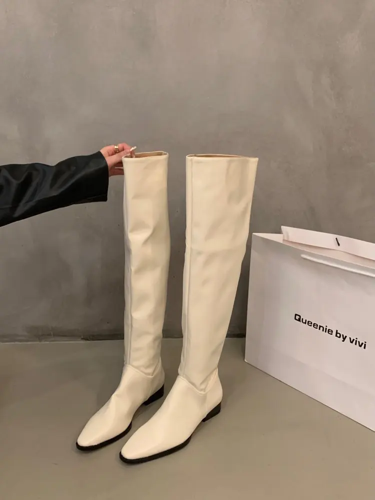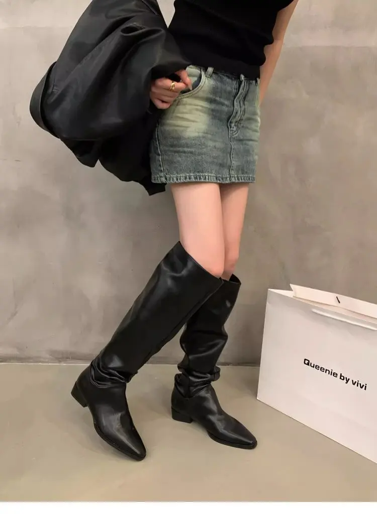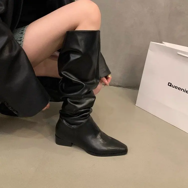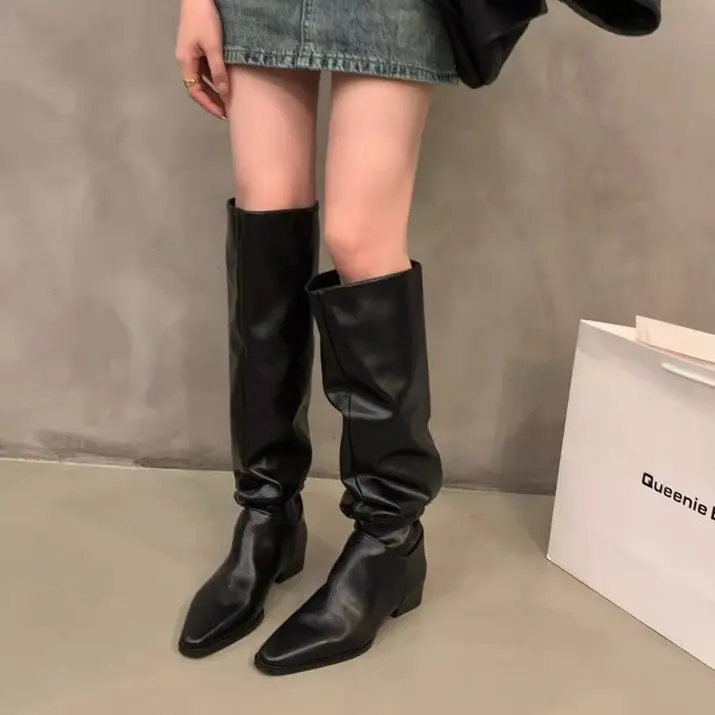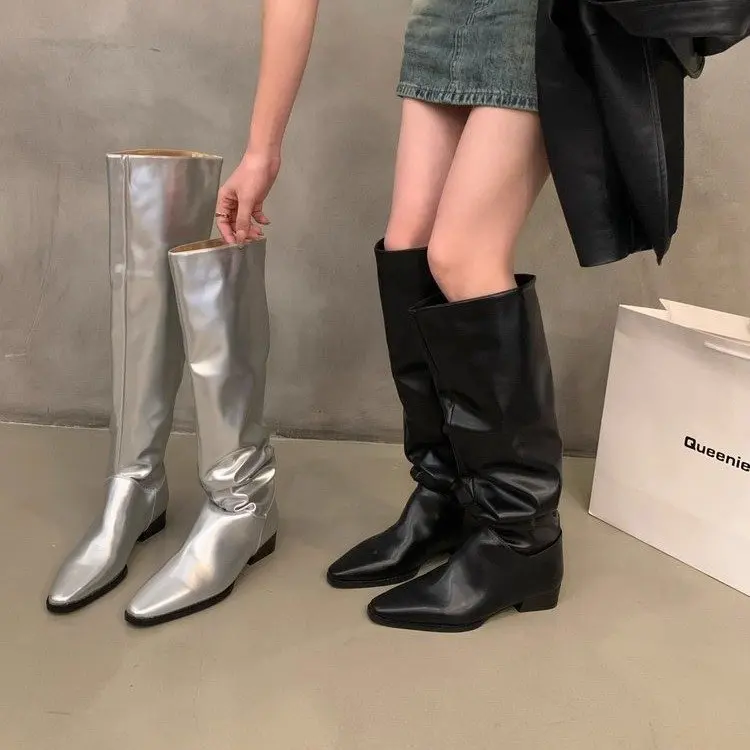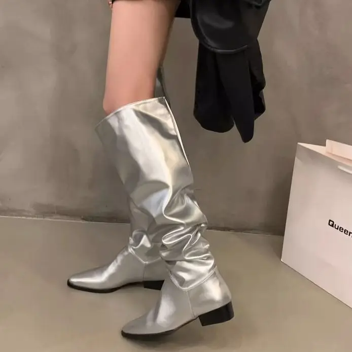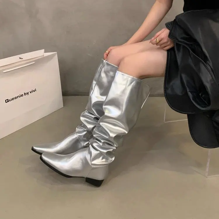 PDEP 2023 ladies point toe thick-heeled silver knee-high boots female fold piled high tube western women chukka cowboy boots
