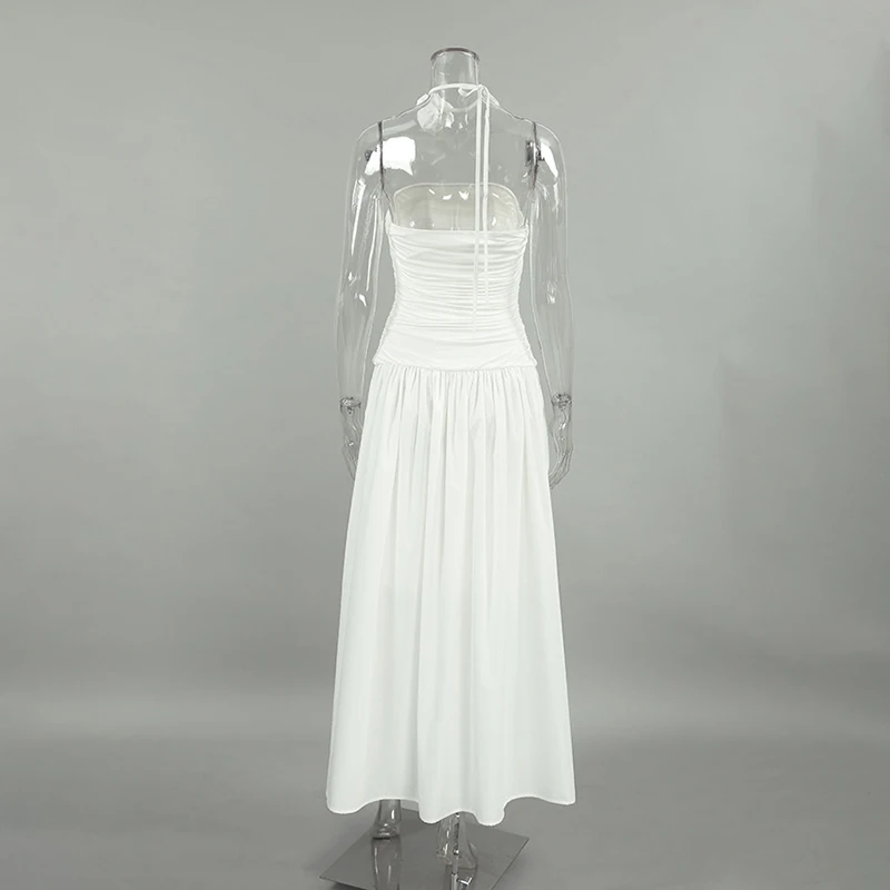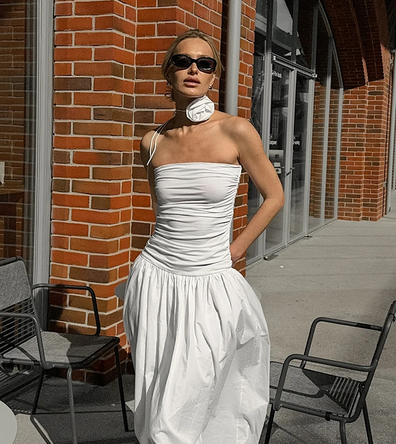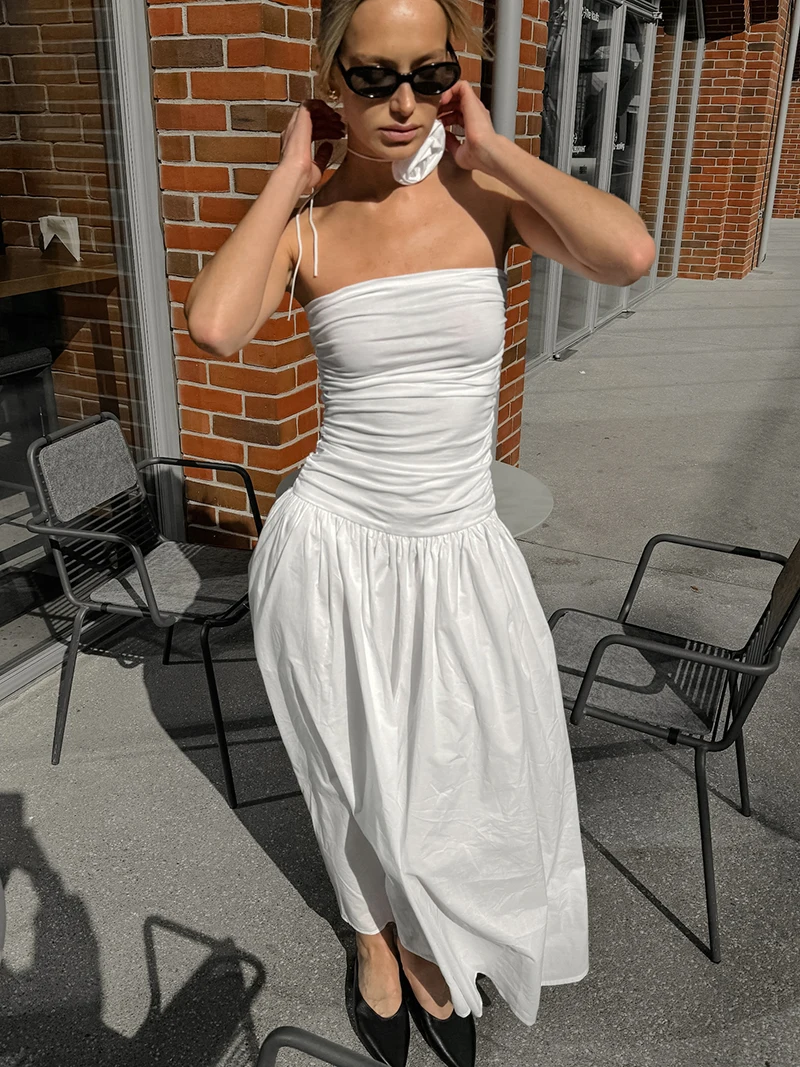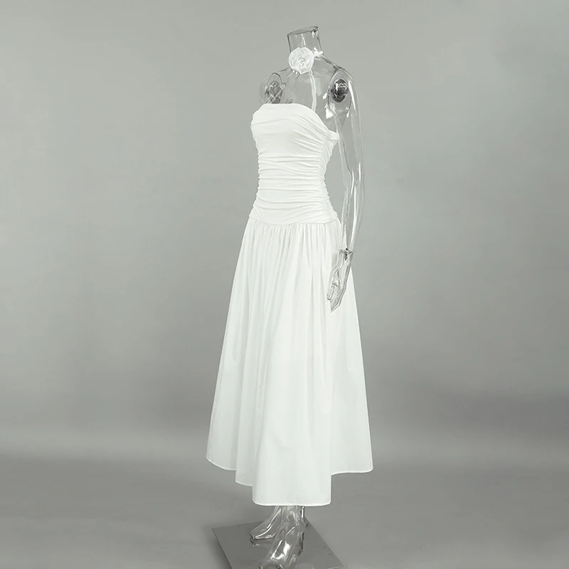 Sexy Elegant Straps Long Dresses for Women Ruched Flower French Party White A-line Dress Off Shoulder Slim Fit High Waist Dress