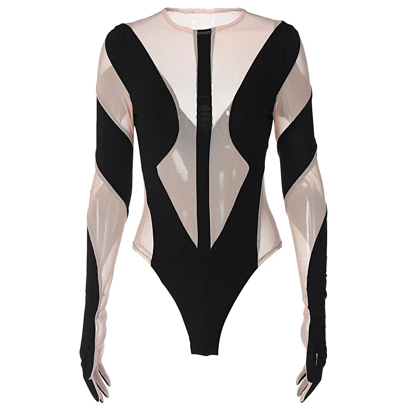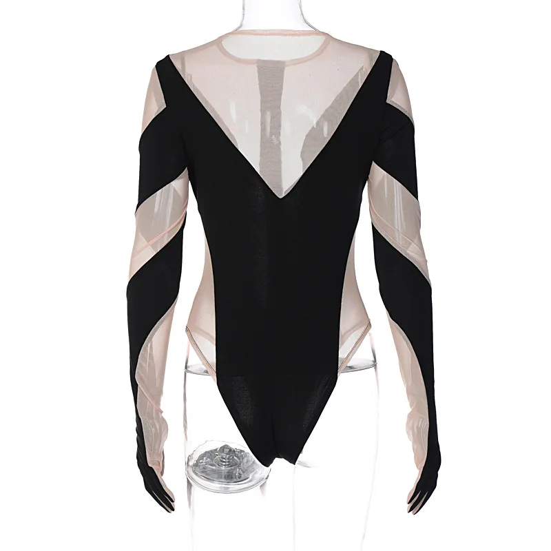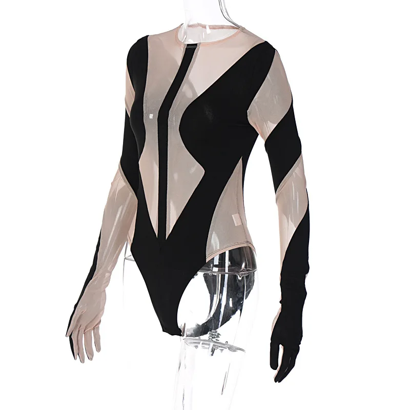 Wholesale Fashion Short Bodycon One Piece Jumpsuit See Through Mesh Long Sleeve Bodysuit Tops for Women